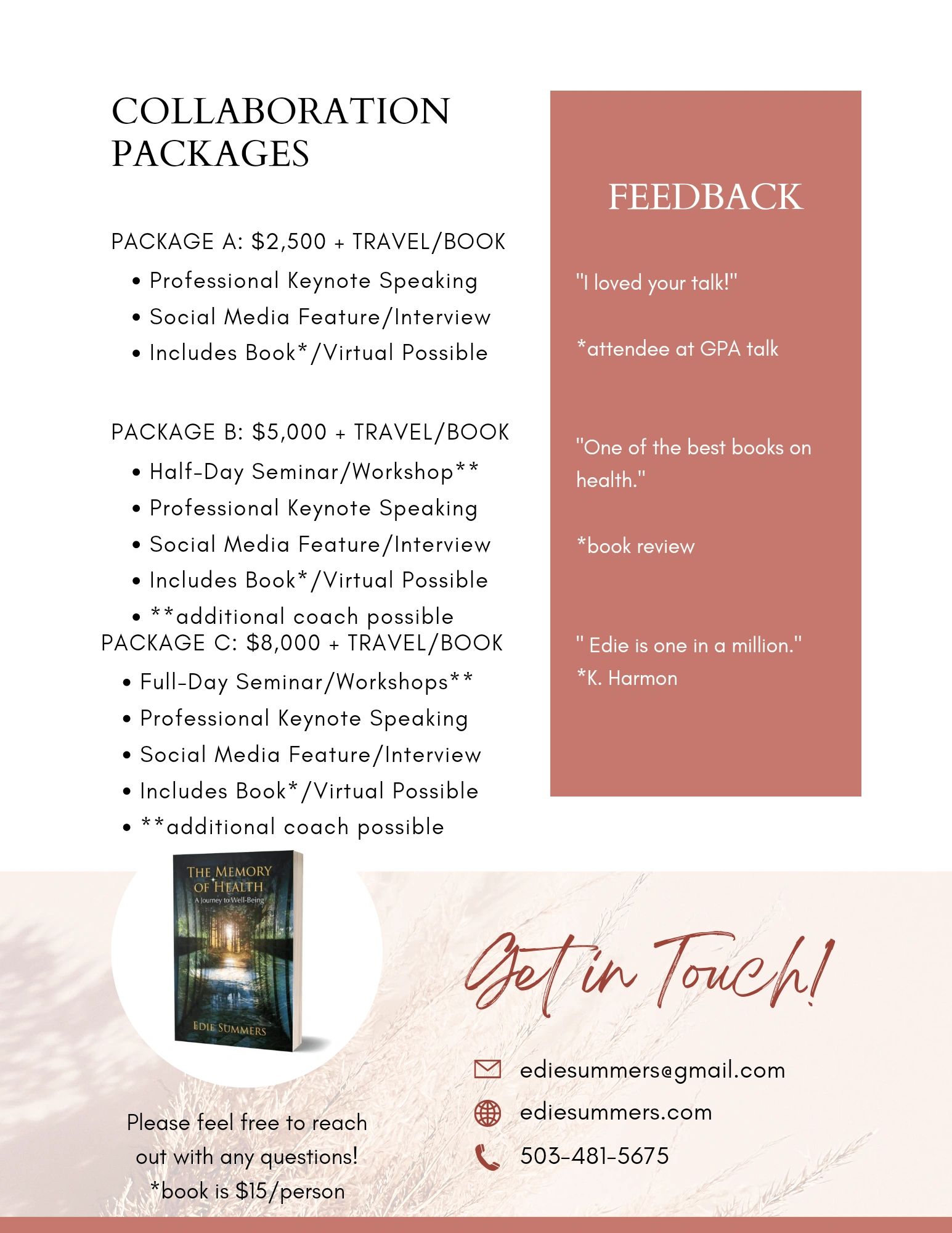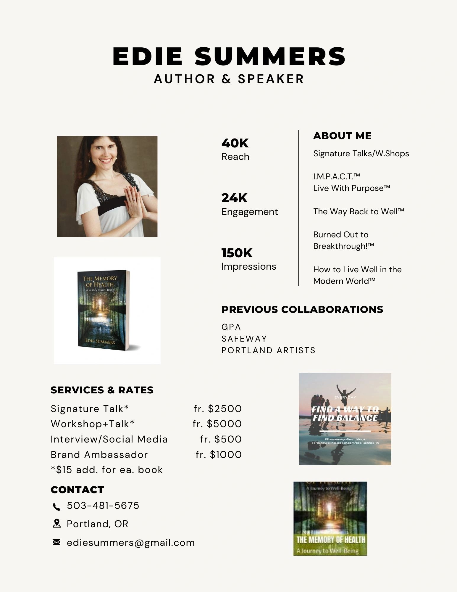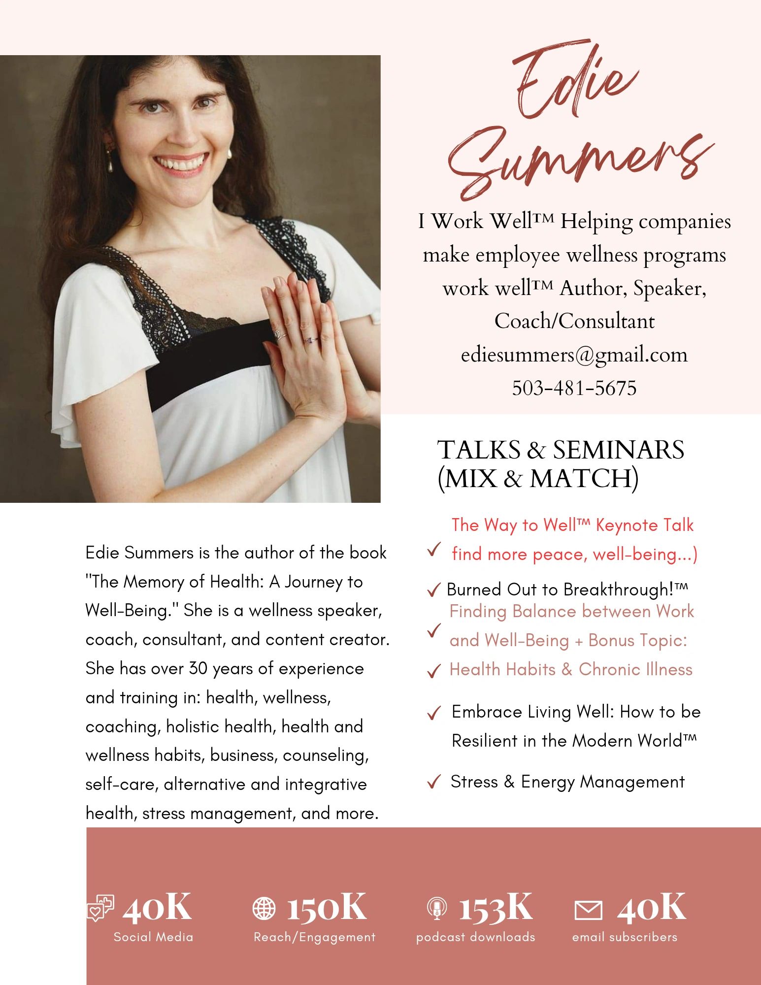 Whether you're looking to improve your energy and well-being, leadership or productivity, find your way back to well, or are seeking a wellness keynote speaker for your next event, or one-on-one coaching or consulting, I have the expertise to help you succeed. With a range of services tailored to your needs, I am committed to helping you achieve your goals. Contact me for your next event or sign up for a coaching package today. Check out my services in detail under the services tab on here, and feel free to reach out to me to get set up for coaching, consulting, or a speaking event: ediesummers @ gmail.com Check out my book: bit.ly/bookonwellness